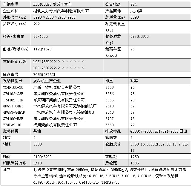 大力牌城市客車  底盤型號:EQ6570K3AC1 額定質(zhì)量: